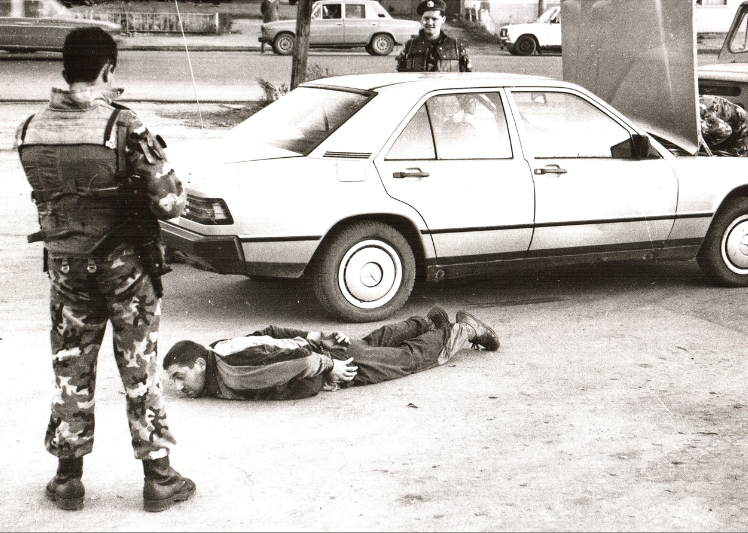 Отдел по борьбе с экономическими преступлениями областного УВД обезвредил группу вымогателей, собиравших дань с операторов АЗС. На снимке: бойцы ОМОН во время захвата преступной группировки на автозаправке. Предположительно 1993 год.
