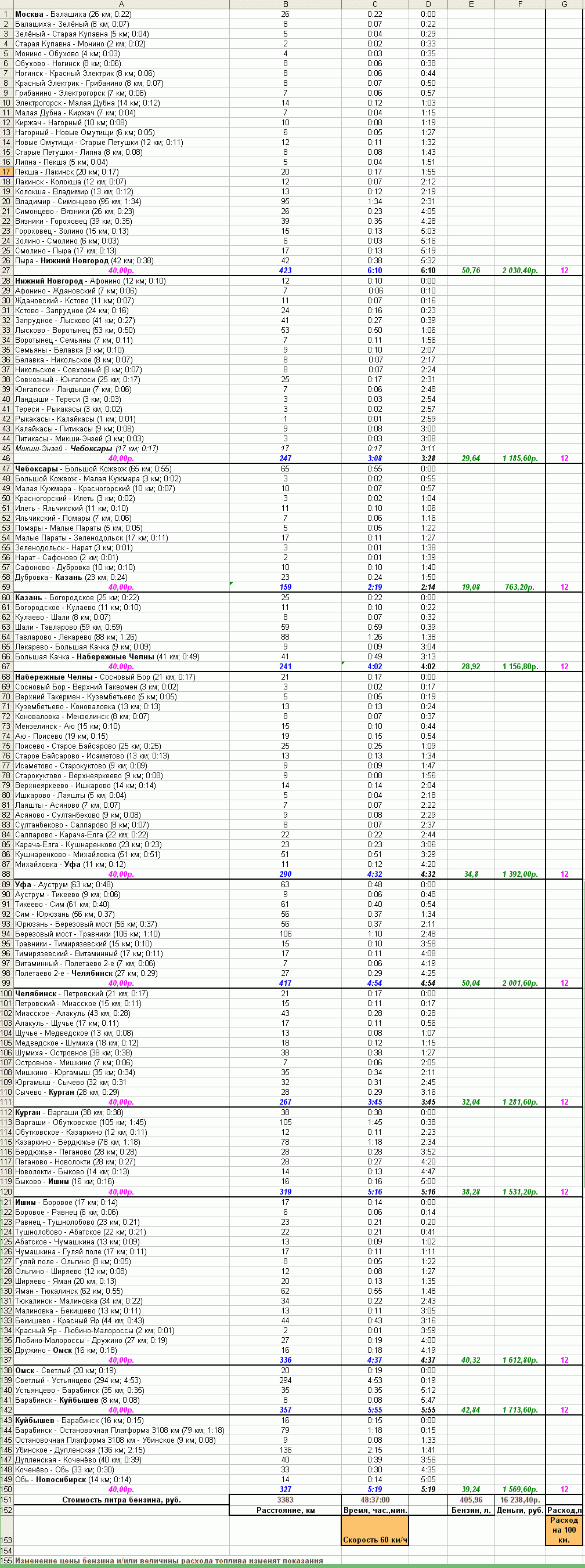 На каждом участке можно ввести свою стоимость литра бензина и расход на 100 км.